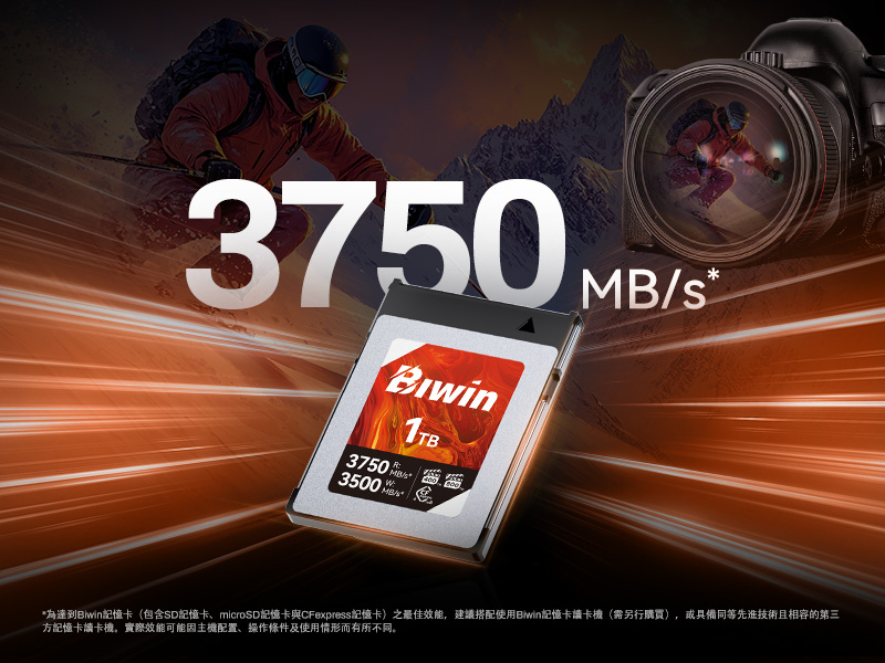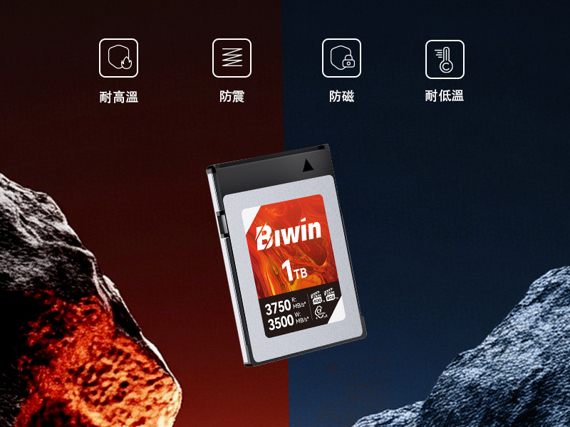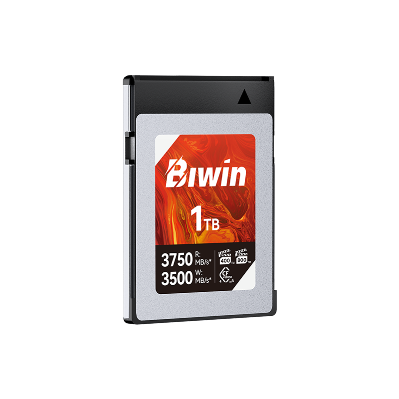 Biwin Amber CB500 CFexpress™ 4.0 Type B記憶卡,為專業級8K影像錄製打造,讀取速度和寫入速度分別高達3750 MB/s和3500 MB/s。強效的散熱設計保證長時間拍攝不中斷。耐用可靠,能夠應對極端溫度、撞擊及環境挑戰,可有效保護資料安全。