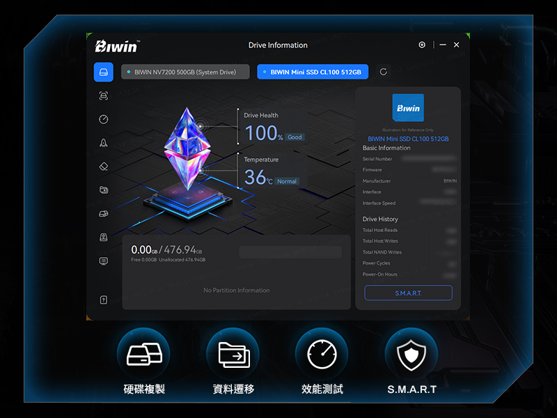Biwin CL100搭載專屬管理軟體,為您提供安全的儲存管理體驗。透過該軟體,用戶可輕鬆執行效能測試、資料遷移、韌體更新等功能,確保硬碟長期保持穩定效能與資料完整性,讓儲存管理變得簡單且高效。
