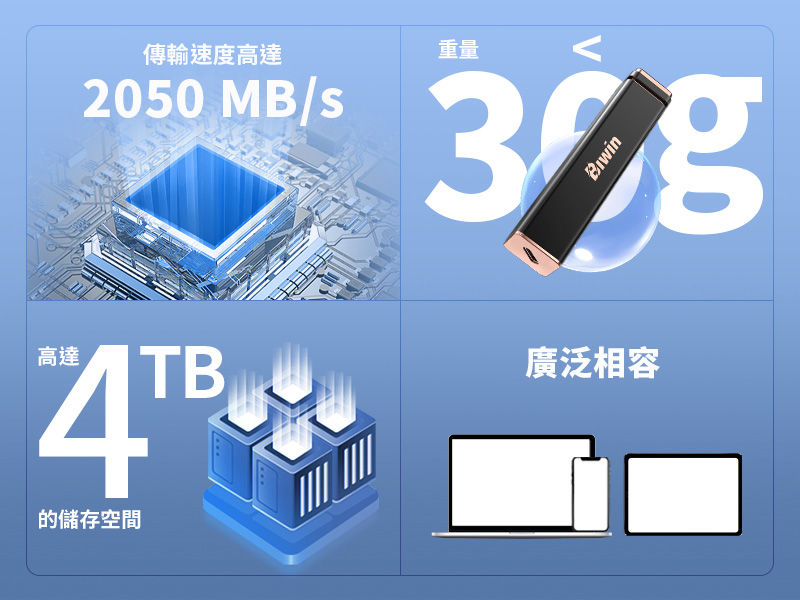 Biwin PD2000行動固態硬碟,讀寫速度高達2050 MB/s和1800 MB/s*,能以iPhone 15/16/17 Pro & Pro Max機型直錄最高ProRes* 4K/120fps影片。4 TB*大容量,大空間滿足所有需求,並具備安全加密與快速備份功能,保護資料安全。輕巧設計,重量不到30克,小巧機身,攜帶方便,隨插即用,支援多種裝置,本事超群。