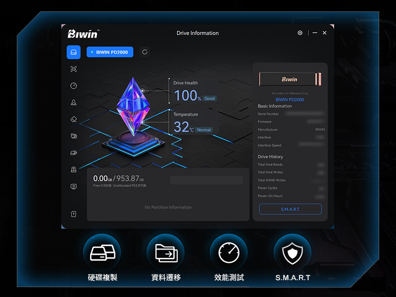 Biwin Intelligence是一款多功能硬碟管理軟體。此軟體專為支援Biwin品牌的儲存產品而設計,包括固態硬碟(SSD)及行動固態硬碟(PSSD)。適用於需要管理Biwin儲存產品的用戶,透過該軟體,用戶可輕鬆執行效能測試、資料遷移、韌體更新等功能,享受便捷安全的儲存管理體驗。