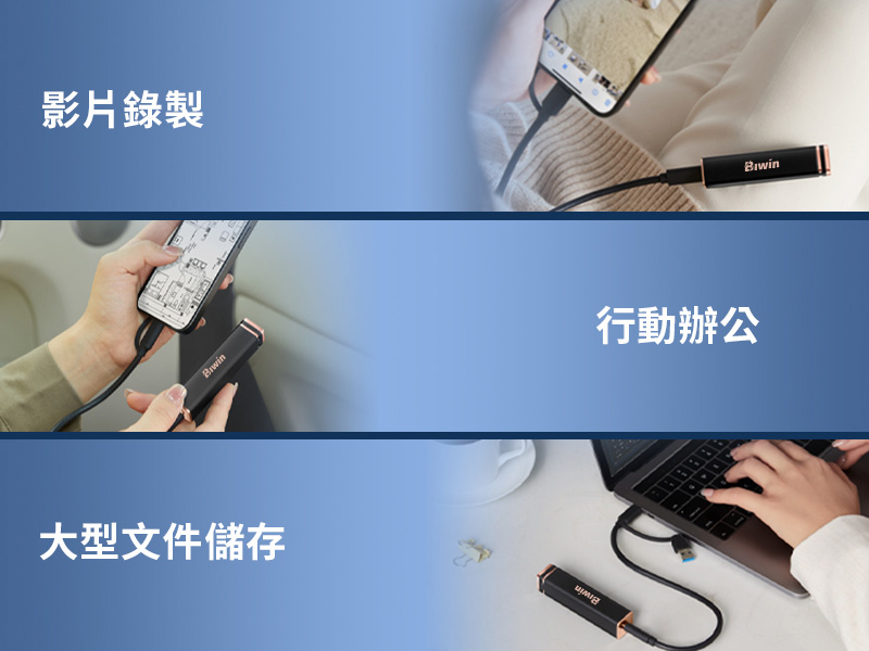 Biwin PD2000可輕鬆連接多種支援USB-C介面的裝置,無論是管理家庭回憶、Vlog 創作*、行動辦公或大型文件,皆可快速存取。隨插即用的設計,隨時隨地存取資料,帶來高效能的行動數位體驗。