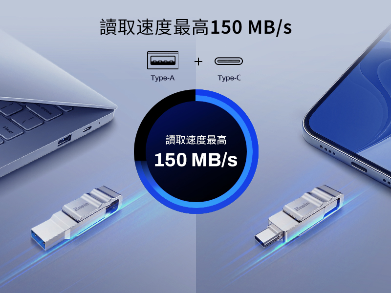 Biwin UD150 採用Type-A / Type-C雙介面設計,讀取速度最高可達150 MB/s,可快速擴充多種裝置的儲存空間。為智慧型手機、平板、筆電或桌機等多種設備*提供便利且高效率的資料存取體驗。
