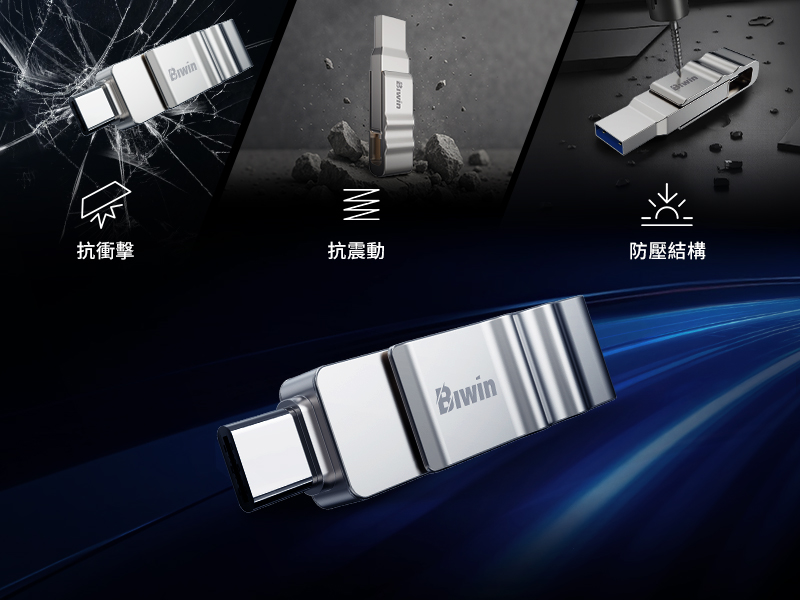 Biwin UD150 採用高品質鋅合金機身,結構堅固耐用。強化外殼設計具備抗衝擊、抗震動與防壓特性,應對各種環境,無懼意外。